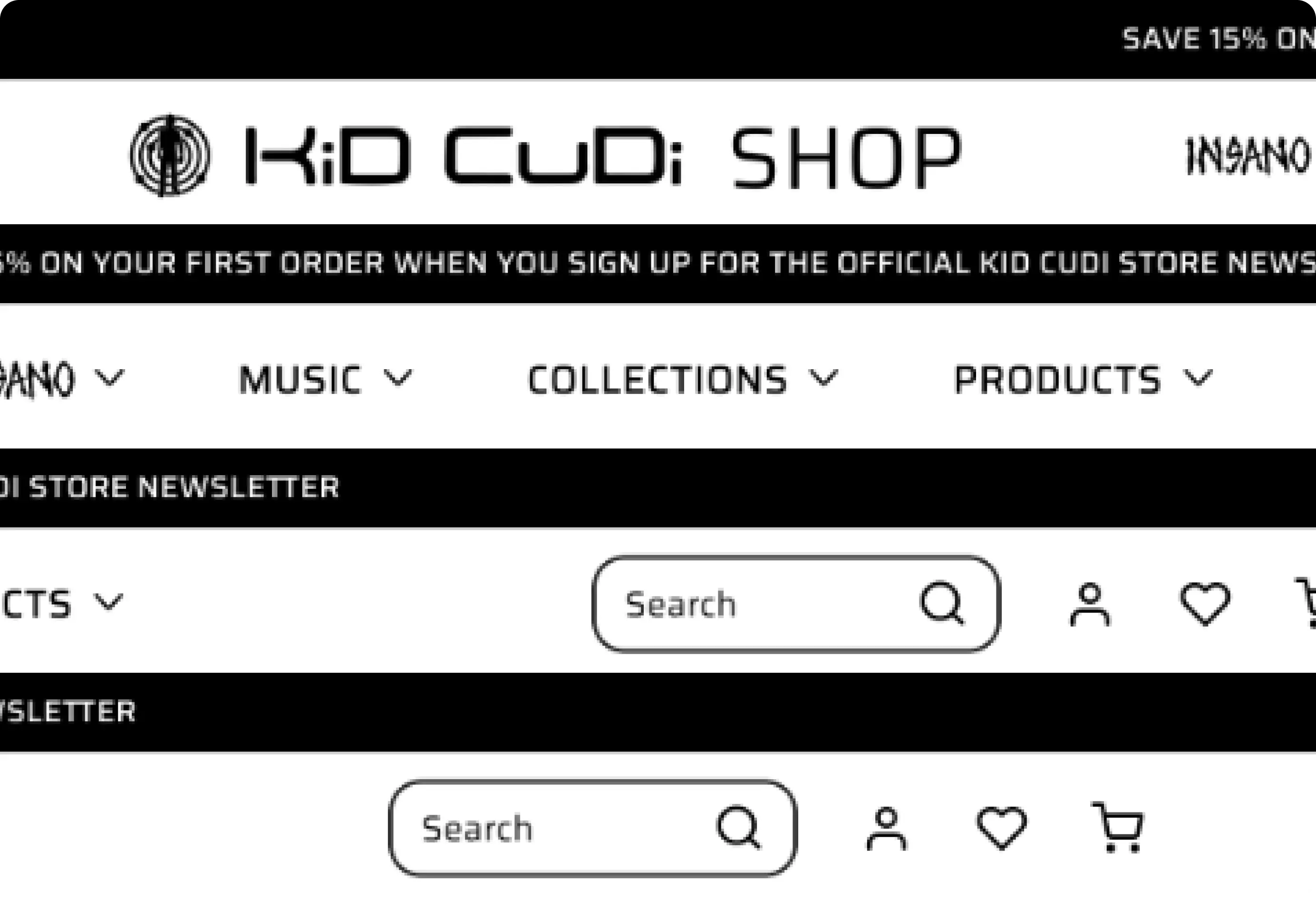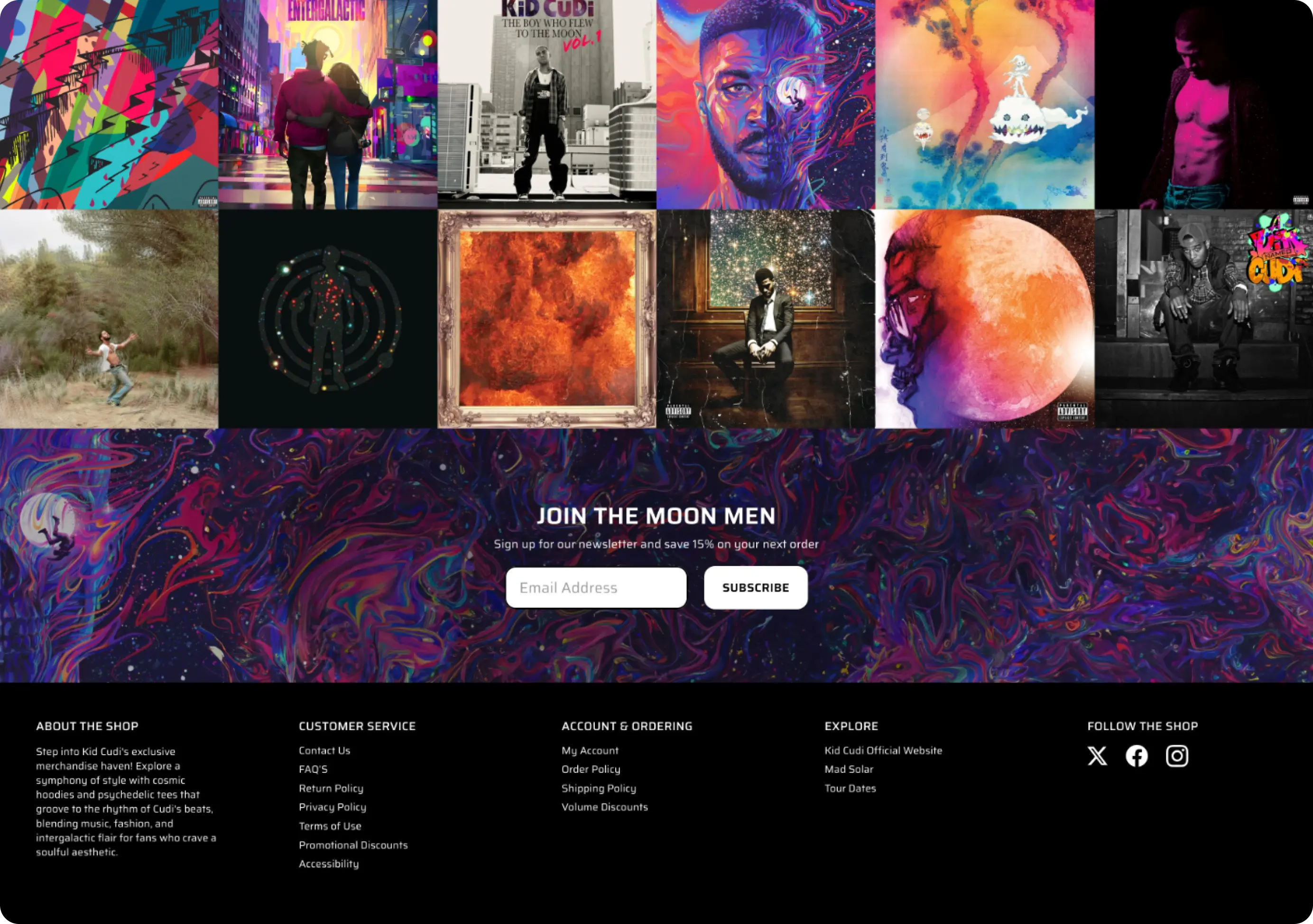 Kid Cudi's shop is an anomaly among great eCommerce stores from artists around the world. Not only were there major accessibility issues, unfamiliar user experiences, and absent standard eCommerce functions, but it also failed to incorporate his one-of-a-kind style. Euphoric, spacey colors and images, his loud and angelic persona, and his push for creativity and challenging the norm were all missing.