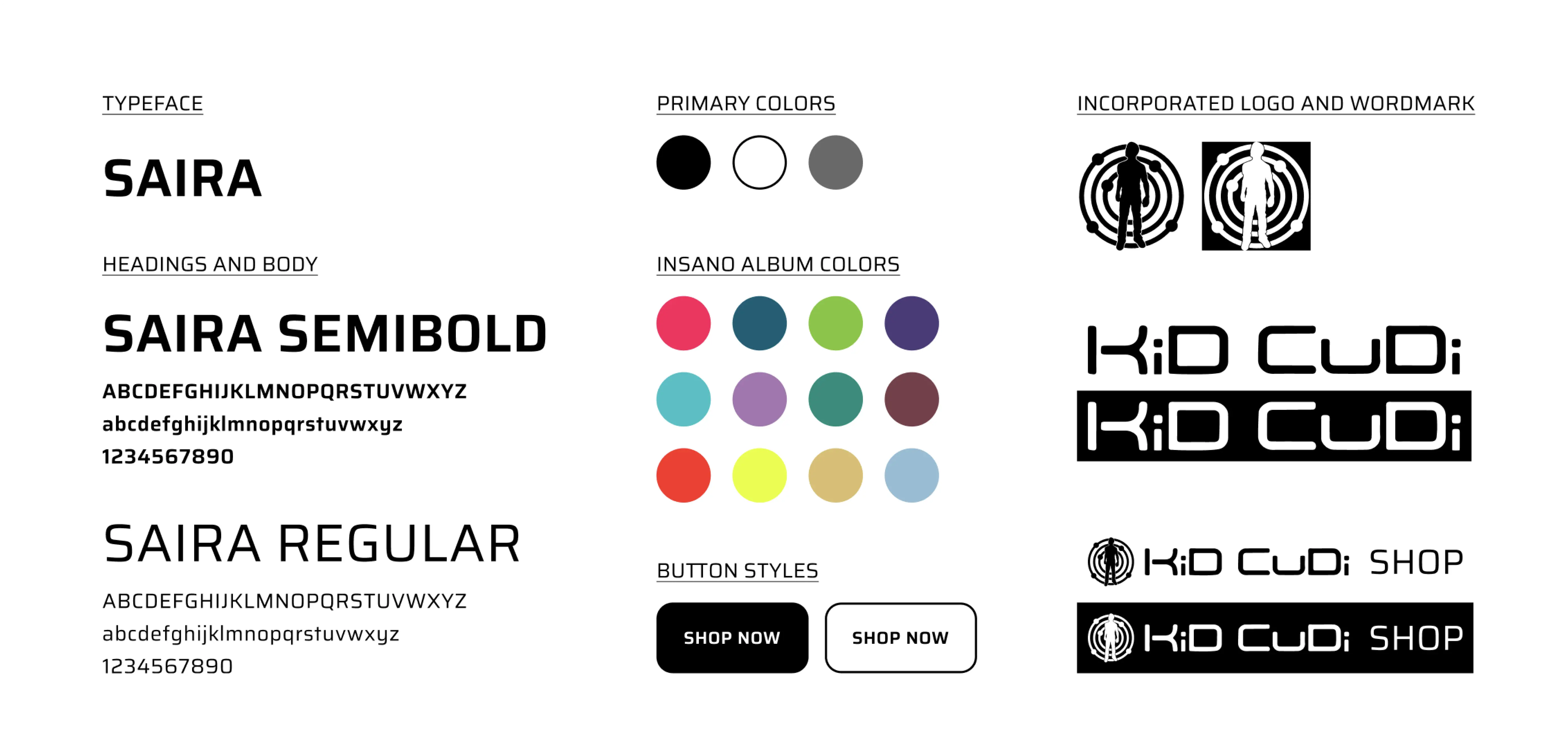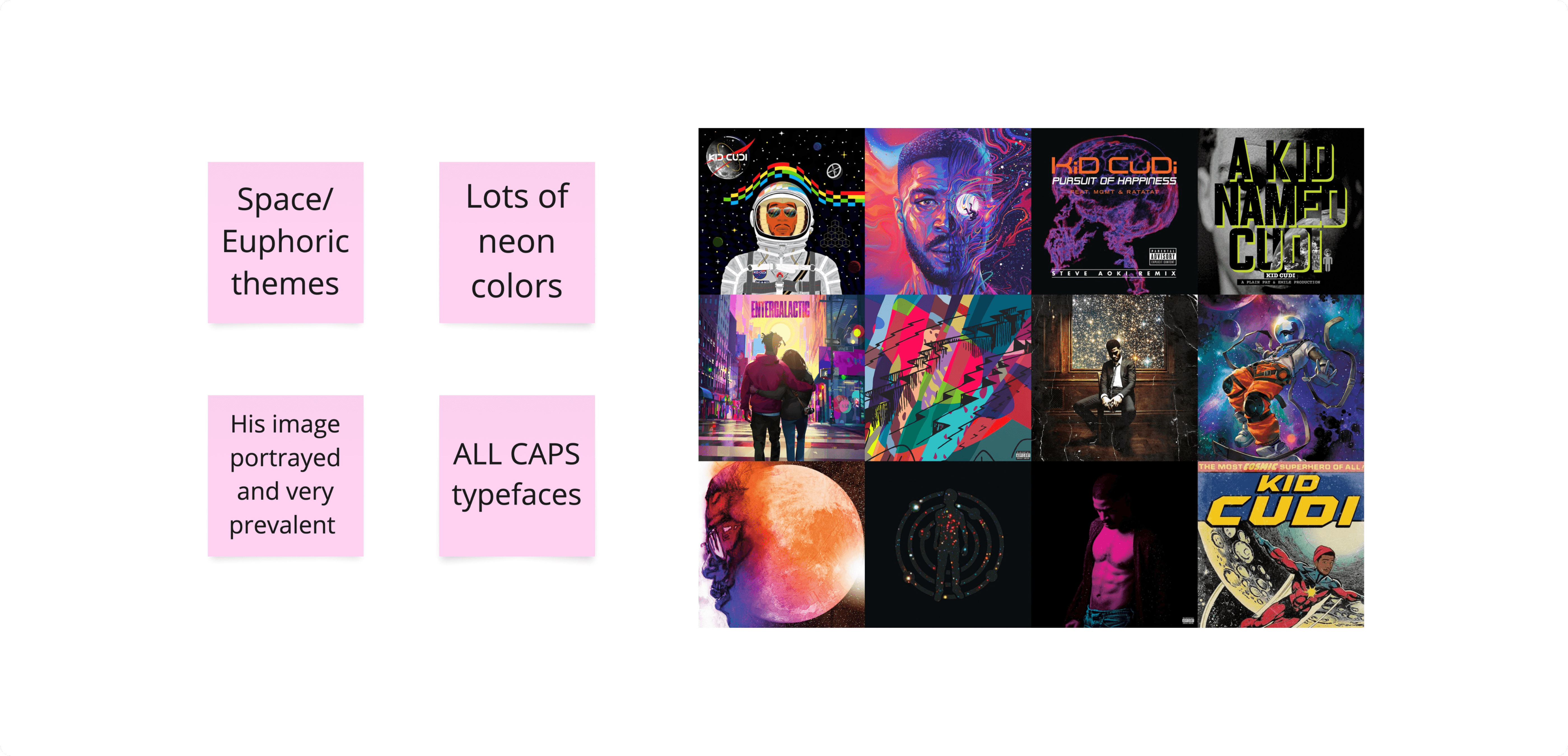 I then took a deep dive into Kid Cudi’s previous branding. Cudi uses space as his main theme. This features black and white as the dominant color ways, with neon and bright colors accompanying it. Although he never uses a certain typeface, he does use CAPS in almost every project. Was there a way to take these attributes (colors, fonts, imagery) and craft the perfect online Kid Cudi presence?