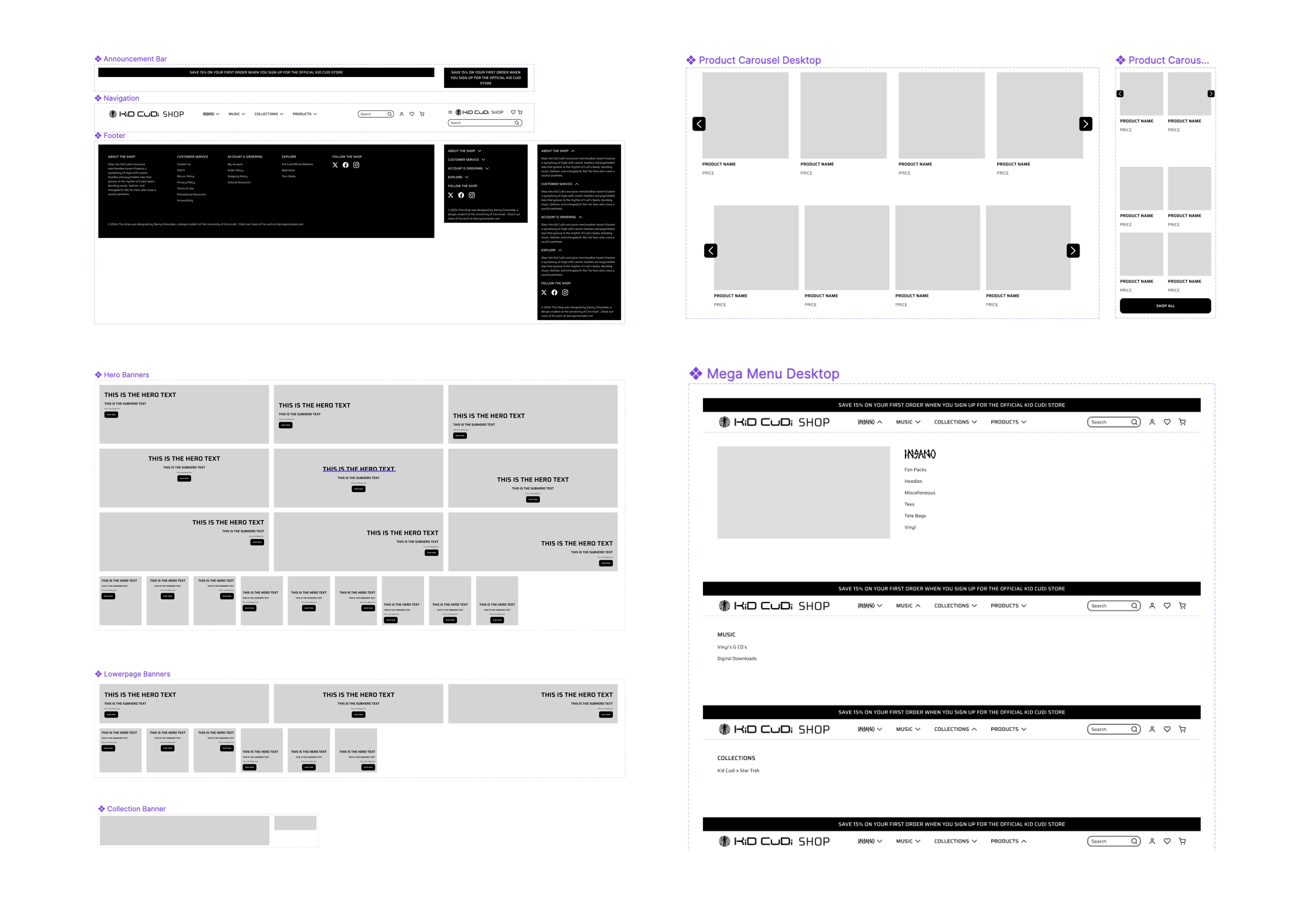 Shown below are some screenshots from the many web components built in Figma for the website. These blocks are the key to building a responsive eCommerce site. These blocks ranged from Navigation and Footers, Hero Banners, Mega Menus, Sign Up Bar, Text Cards, and more.