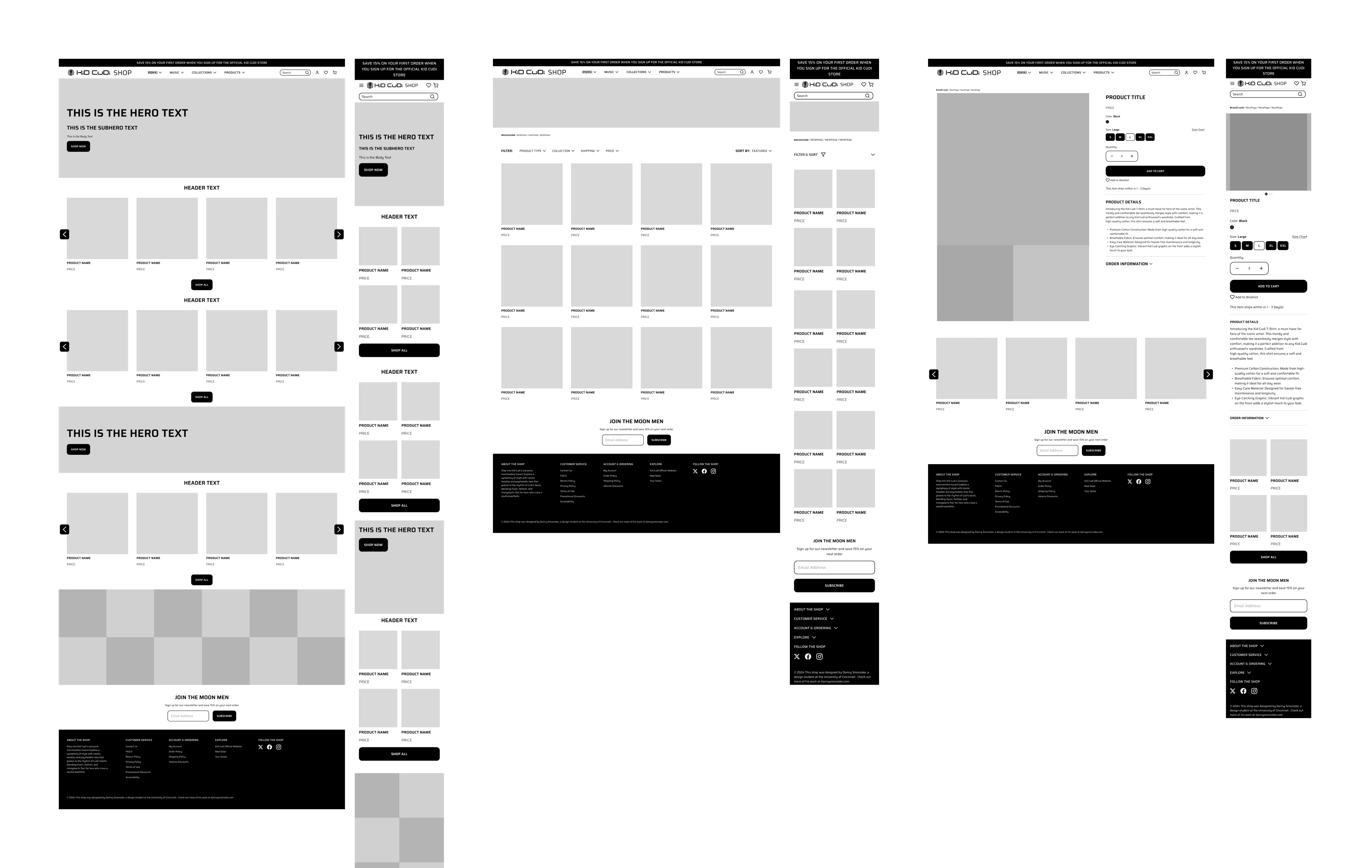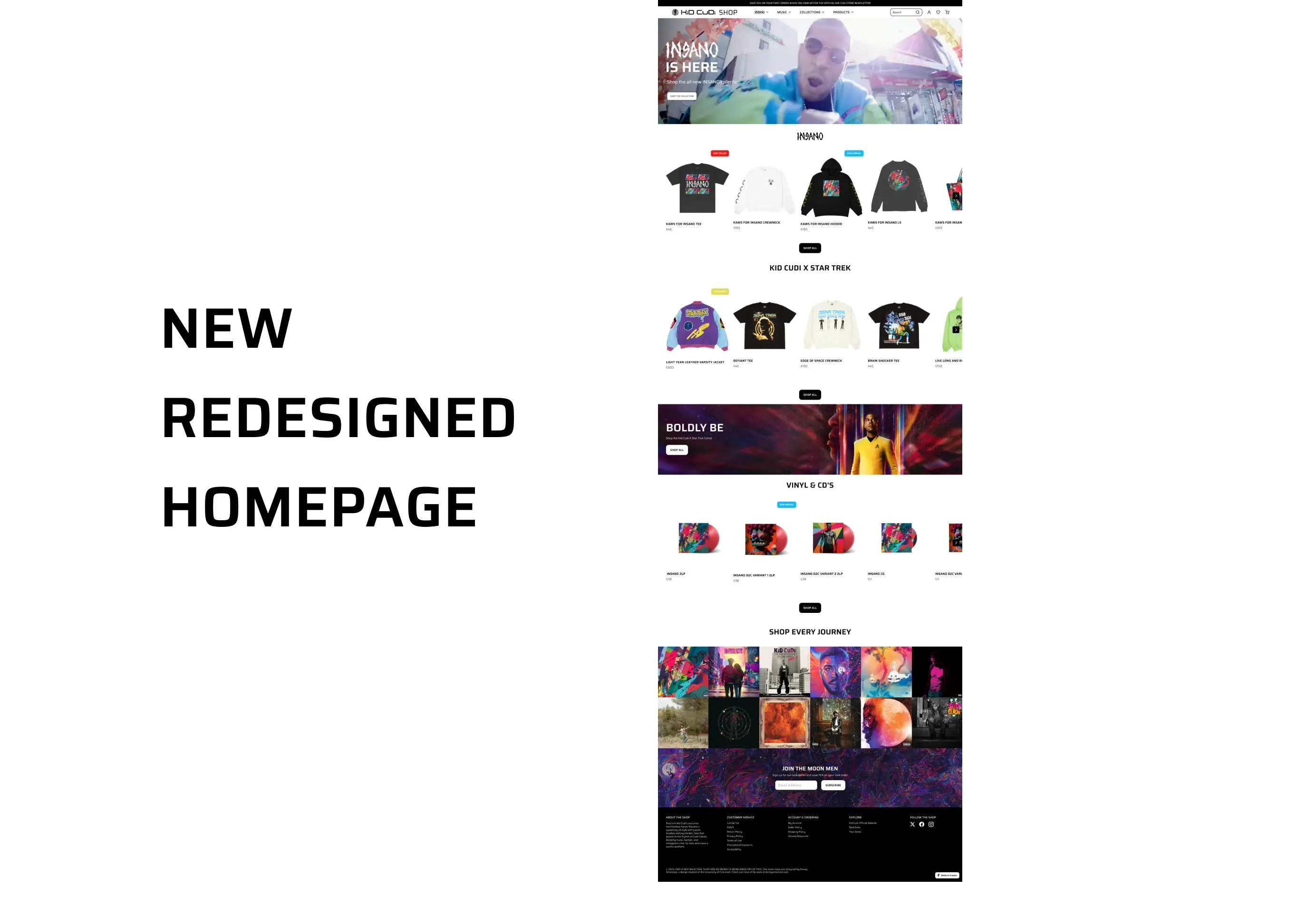 I'm super proud of where this project ended up! I finished with a much-improved eCommerce site featuring many new elements that enhance the user experience. I improved accessibility not just for active Kid Cudi fans but also for other users, such as parents looking for a gift or those unfamiliar with Kid Cudi. The site now aligns more with standard eCommerce conventions, bringing familiarity to users (think Jakob's Law), while also incorporating Kid Cudi's euphoric brand and fun personality.
