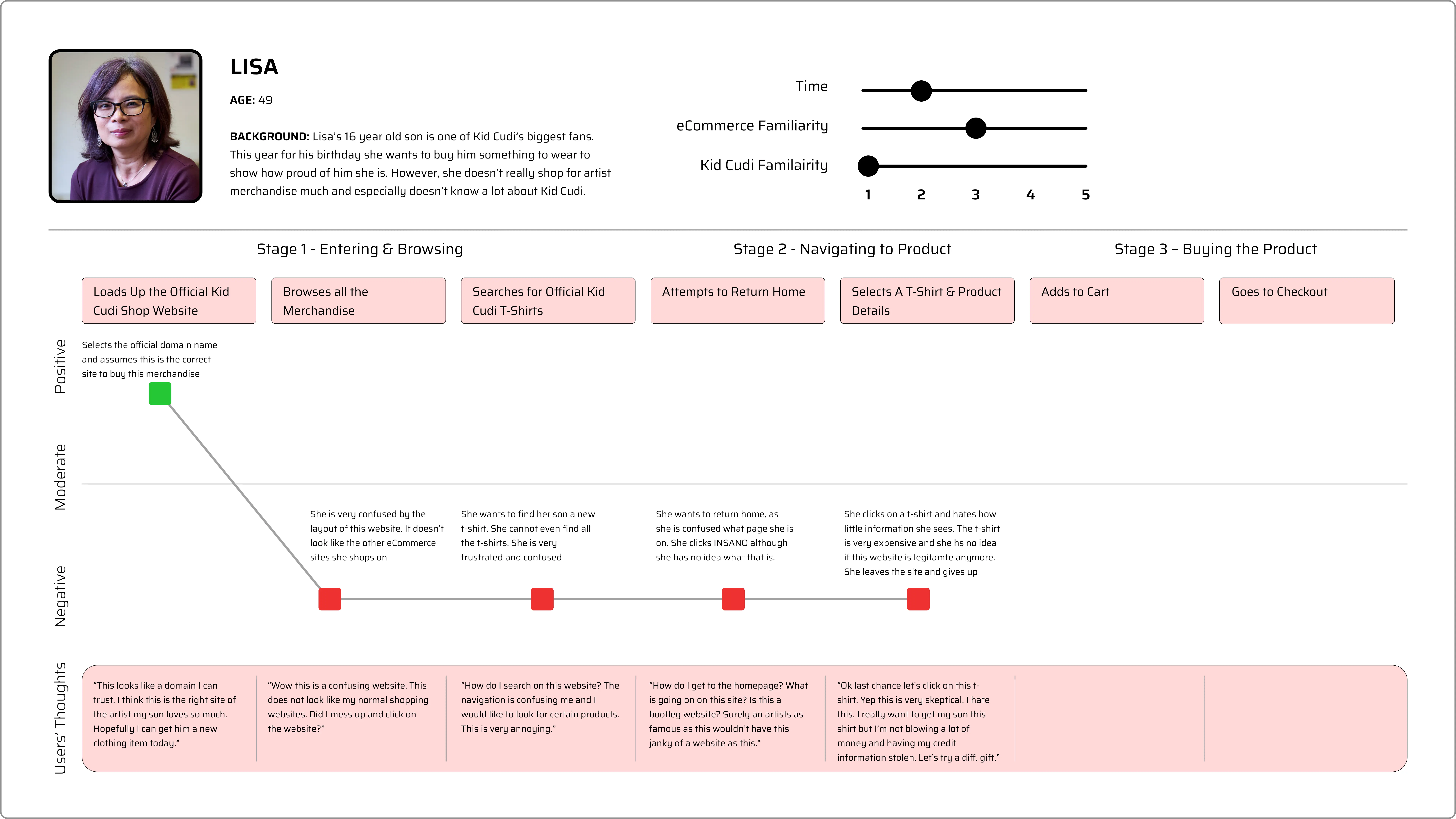 Next, I wanted to map out each users’ journey. If I was looking at the site through their eyes, what would work effortlessly? What problems would I run into? Is there anything I wouldn’t trust?