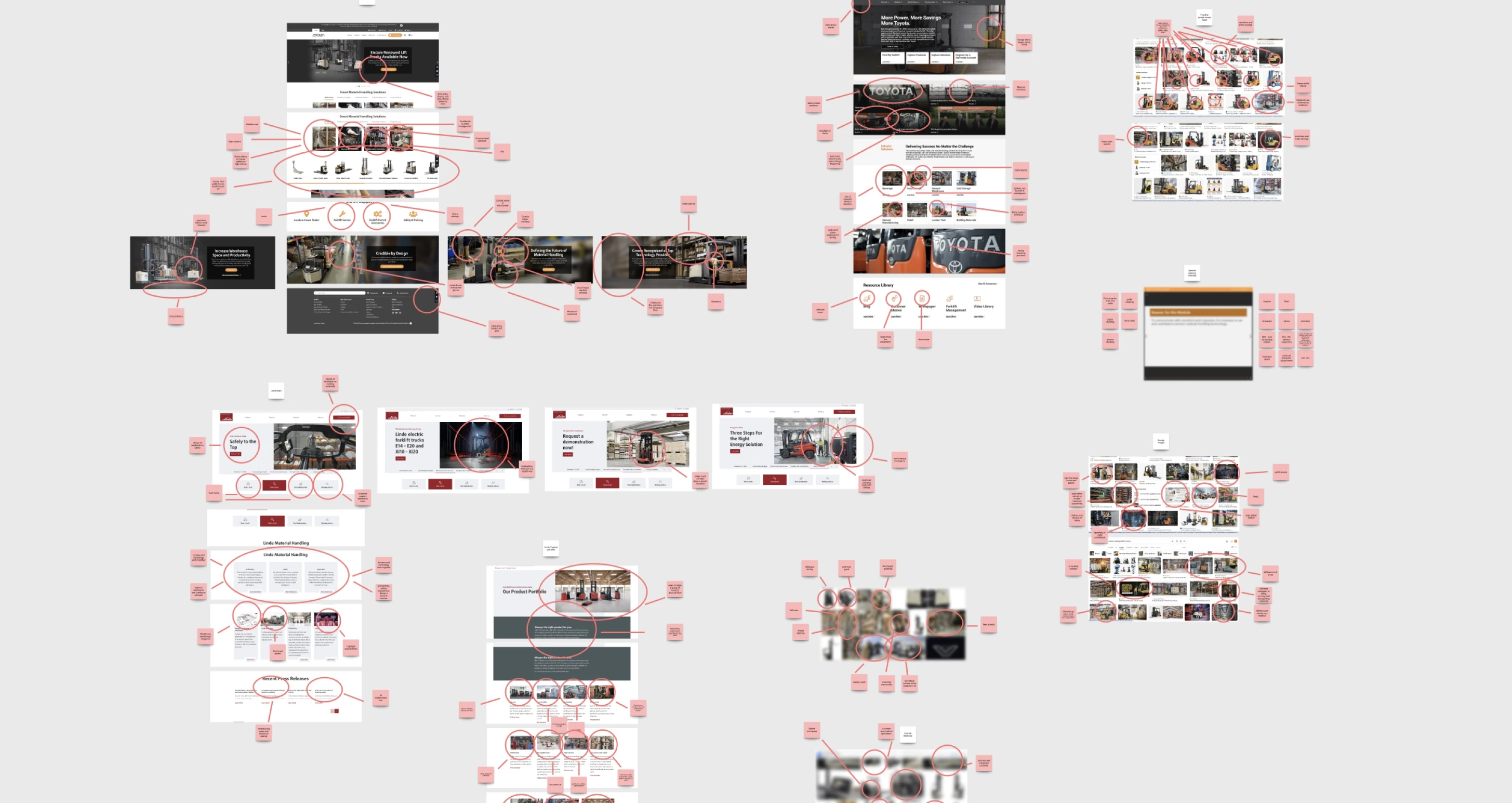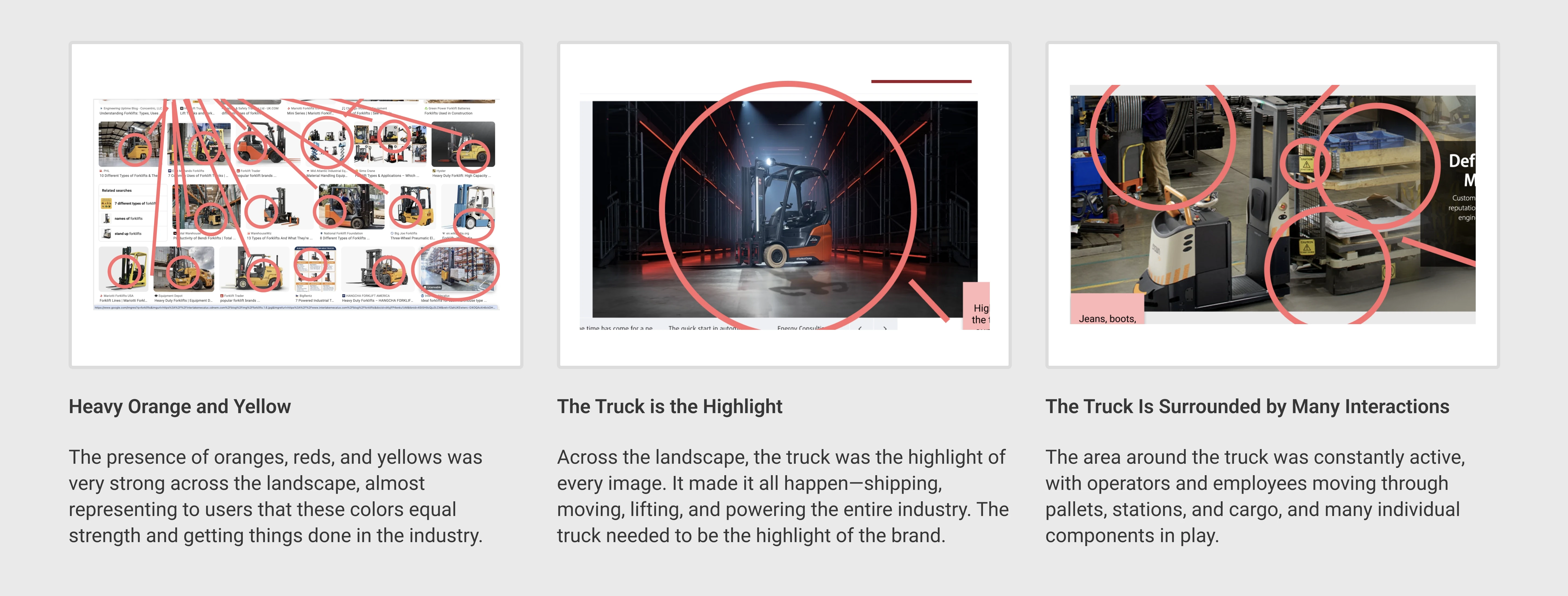 I also needed to learn what did designing for the material handling industry feel like? I did a landscape analysis of many material handling websites, internal resources, and Crown products to analyze colors, feel, typefaces, visuals, etc.. I came to 3 main insights below.