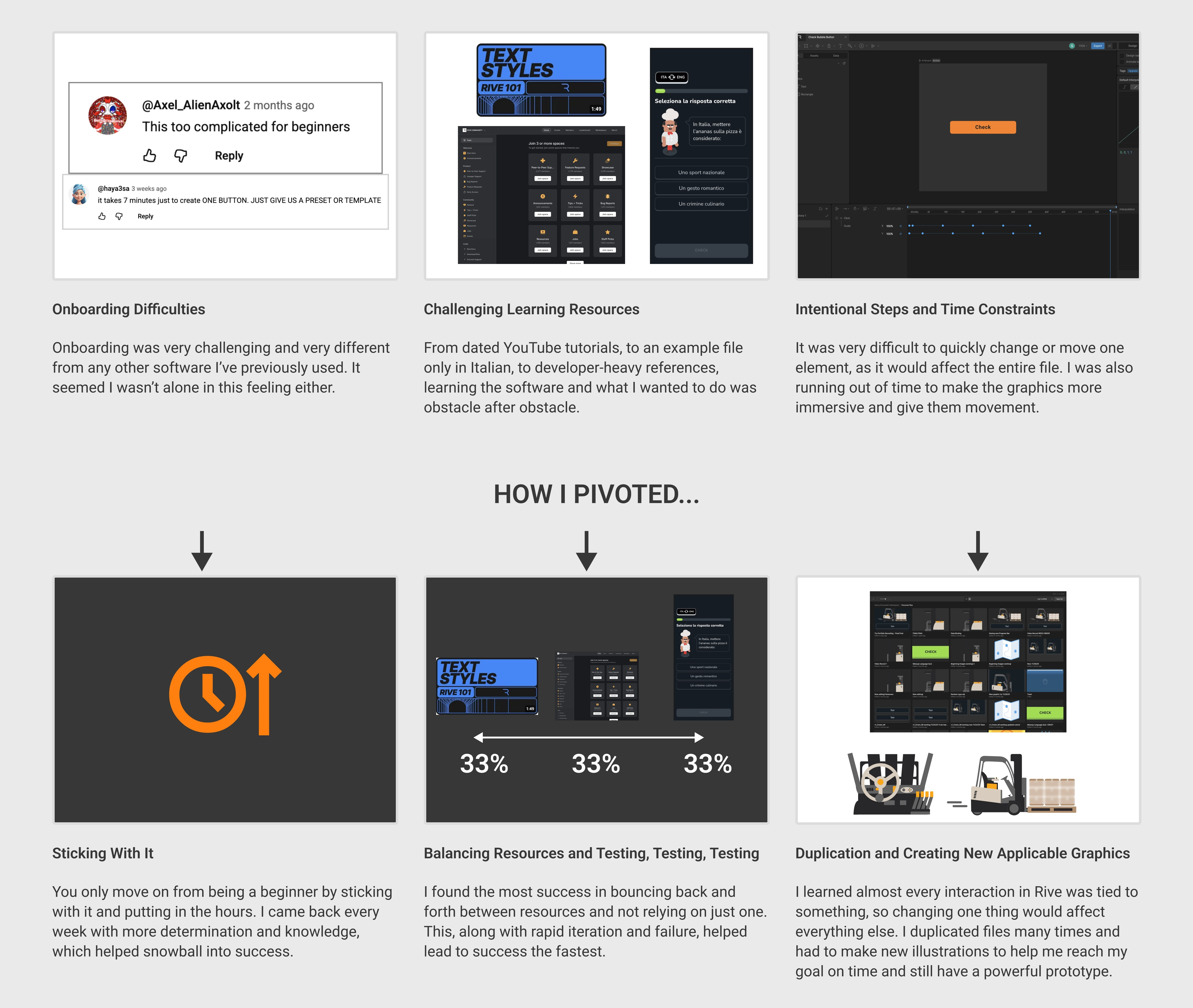 I ended up with a successful, ready-to-ship product built in Rive, incorporating five microinteractions to help enhance the learning experience for users.