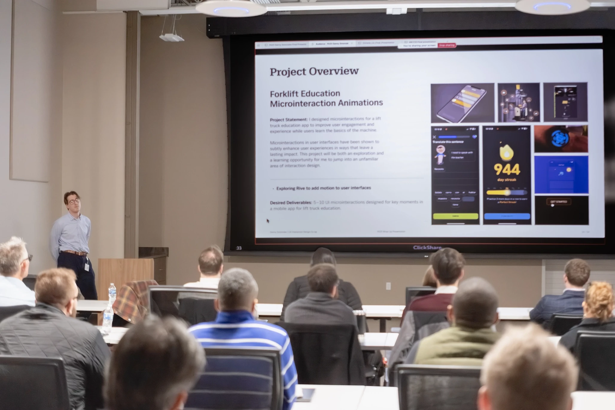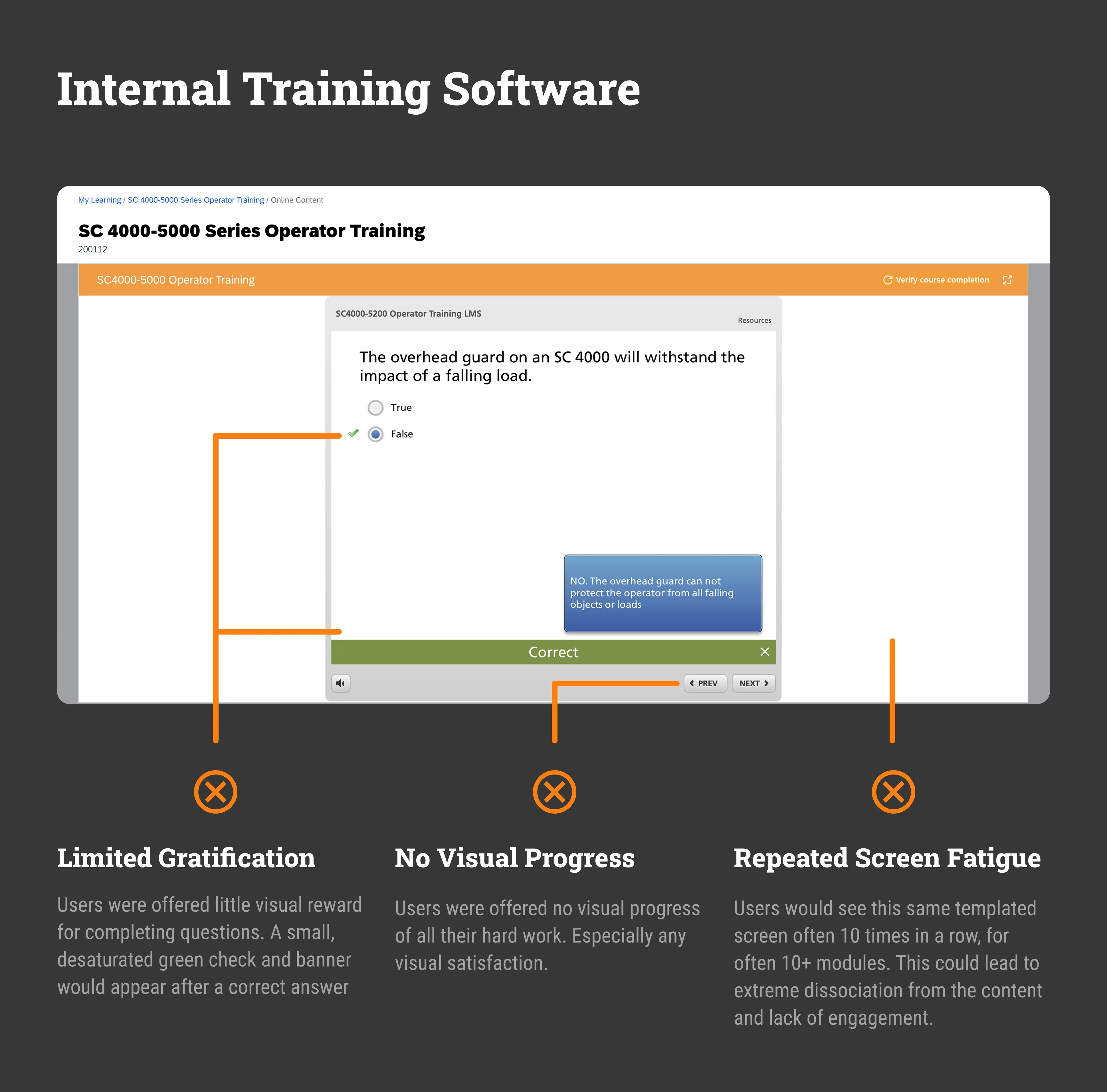 New employees, including myself, spent weeks training on the material handling industry and Crown’s massive fleet of trucks. This training required countless hours engaging with an unengaging experience that offered no visual sense of progress and limited gratification.