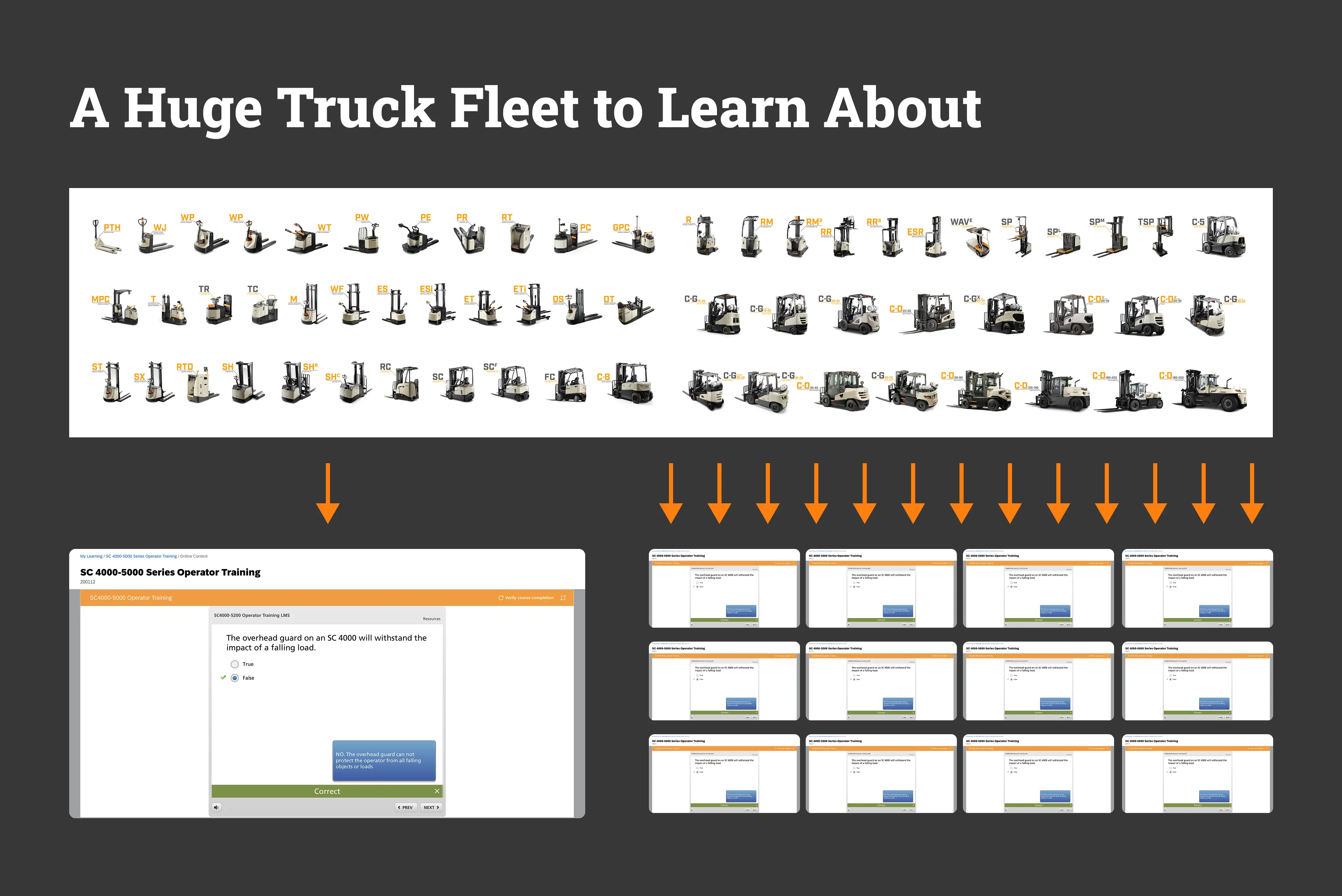 Image of Crown's massive Truck Fleet and visual representation of the amount of accompanying training modules needed to complete in order to learn about them